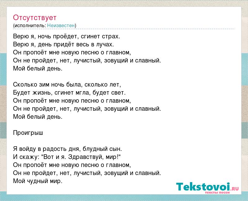 Верю я, ночь проёдет, сгинет страх. Верю я, день придёт весь в лучах. Он пропоёт мне новую песню о главном, Он не пройдет, нет, лучистый, зовущий и славный. Мой белый день. Сколько зим ночь была, сколько лет, Будет жизнь, сгинет мгла, будет свет. Он пропоёт мне новую песню о главном, Он не пройдет, нет, лучистый, зовущий и славный. Мой белый день. Проигрыш Я войду в радость дня, блудный сын. И скажу: "Вот и я. Здравствуй, мир!" Он пропоёт мне новую песню о главном, Он не пройдет, нет, лучистый, зовущий и славный. Мой чудный мир.