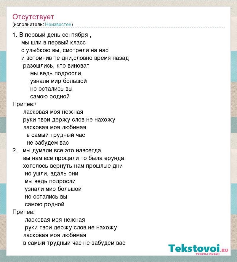 1. В первый день сентября , мы шли в первый класс с улыбкою вы, смотрели на нас и вспомнив те дни,словно время назад разошлись, кто виноват мы ведь подросли, узнали мир большой но остались вы самою родной Припев:/ ласковая моя нежная руки твои держу слов не нахожу ласковая моя любимая в самый трудный час не забудем вас 2. мы думали все это навсегда вы нам все прощали то была ерунда хотелось вернуть нам прошлые дни но ушли, вдаль они мы ведь подросли узнали мир большой но остались вы самою родной Припев: ласковая моя нежная руки твои держу слов не нахожу ласковая моя любимая в самый трудный час не забудем вас