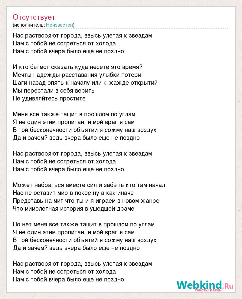 Нас растворяют города, ввысь улетая к звездам Нам с тобой не согреться от холода Нам с тобой вчера было еще не поздно И кто бы мог сказать куда несете это время? Мечты надежды расставания улыбки потери Шаги назад опять к началу или к жажде открытий Мы перестали в себя верить Не удивляйтесь простите Меня все также тащит в прошлом по углам Я не один этим пропитан, и мой враг я сам В той бесконечности объятий я сожму наш воздух Да и зачем? ведь вчера было еще не поздно Нас растворяют города, ввысь улетая к звездам Нам с тобой не согреться от холода Нам с тобой вчера было еще не поздно Может набраться вместе сил и забыть кто там начал Нас не оставит мир в покое ну а как иначе Представь на миг что ты и я играем в новом жанре Что мимолетная история в ушедшей драме Но нет меня все также тащит в прошлом по углам Я не один этим пропитан, и мой враг я сам В той бесконечности объятий я сожму наш воздух Да и зачем? ведь вчера было еще не поздно Нас растворяют города, ввысь улетая к звездам Нам с тобой не согреться от холода Нам с тобой вчера было еще не поздно