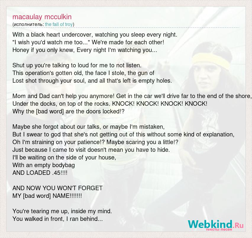 With a black heart undercover, watching you sleep every night. "I wish you'd watch me too..." We're made for each other! Honey if you only knew, Every night I'm watching you... Shut up you're talking to loud for me to not listen. This operation's gotten old, the face I stole, the gun of Lost shot through your soul, and all that's left is empty holes. Mom and Dad can't help you anymore! Get in the car we'll drive far to the end of the shore, Under the docks, on top of the rocks. KNOCK! KNOCK! KNOCK! KNOCK! Why the [bad word] are the doors locked!? Maybe she forgot about our talks, or maybe I'm mistaken, But I swear to god that she's not getting out of this without some kind of explanation, Oh I'm straining on your patience!? Maybe scaring you a little!? Just because I came to visit doesn't mean you have to hide. I'll be waiting on the side of your house, With an empty bodybag AND LOADED .45!!!! AND NOW YOU WON'T FORGET MY [bad word] NAME!!!!!!! You're tearing me up, inside my mind. You walked in front, I ran behind...