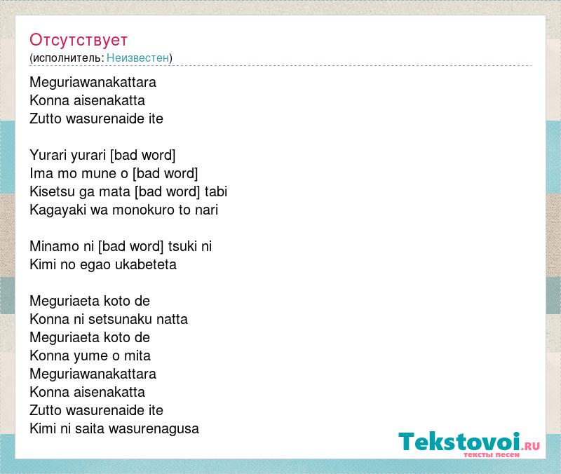 Meguriawanakattara Konna aisenakatta Zutto wasurenaide ite Yurari yurari [bad word] Ima mo mune o [bad word] Kisetsu ga mata [bad word] tabi Kagayaki wa monokuro to nari Minamo ni [bad word] tsuki ni Kimi no egao ukabeteta Meguriaeta koto de Konna ni setsunaku natta Meguriaeta koto de Konna yume o mita Meguriawanakattara Konna aisenakatta Zutto wasurenaide ite Kimi ni saita wasurenagusa