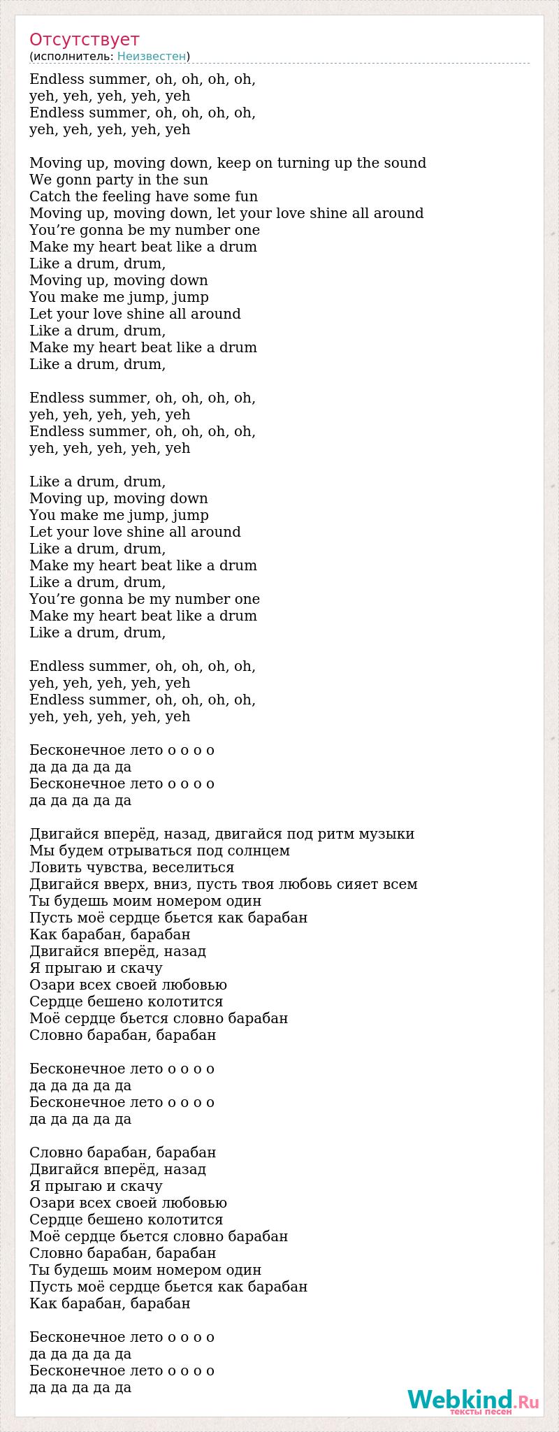 Endless summer, oh, oh, oh, oh, yeh, yeh, yeh, yeh, yeh Endless summer, oh, oh, oh, oh, yeh, yeh, yeh, yeh, yeh Moving up, moving down, keep on turning up the sound We gonn party in the sun Catch the feeling have some fun Moving up, moving down, let your love shine all around You’re gonna be my number one Make my heart beat like a [bad word] Like a [bad word] [bad word] Moving up, moving down You make me jump, jump Let your love shine all around Like a [bad word] [bad word] Make my heart beat like a [bad word] Like a [bad word] [bad word] Endless summer, oh, oh, oh, oh, yeh, yeh, yeh, yeh, yeh Endless summer, oh, oh, oh, oh, yeh, yeh, yeh, yeh, yeh Like a [bad word] [bad word] Moving up, moving down You make me jump, jump Let your love shine all around Like a [bad word] [bad word] Make my heart beat like a [bad word] Like a [bad word] [bad word] You’re gonna be my number one Make my heart beat like a [bad word] Like a [bad word] [bad word] Endless summer, oh, oh, oh, oh, yeh, yeh, yeh, yeh, yeh Endless summer, oh, oh, oh, oh, yeh, yeh, yeh, yeh, yeh Бесконечное лето о о о о да да да да да Бесконечное лето о о о о да да да да да Двигайся вперёд, назад, двигайся под ритм музыки Мы будем отрываться под солнцем Ловить чувства, веселиться Двигайся вверх, вниз, пусть твоя любовь сияет всем Ты будешь моим номером один Пусть моё сердце бьется как барабан Как барабан, барабан Двигайся вперёд, назад Я прыгаю и скачу Озари всех своей любовью Сердце бешено колотится Моё сердце бьется словно барабан Словно барабан, барабан Бесконечное лето о о о о да да да да да Бесконечное лето о о о о да да да да да Словно барабан, барабан Двигайся вперёд, назад Я прыгаю и скачу Озари всех своей любовью Сердце бешено колотится Моё сердце бьется словно барабан Словно барабан, барабан Ты будешь моим номером один Пусть моё сердце бьется как барабан Как барабан, барабан Бесконечное лето о о о о да да да да да Бесконечное лето о о о о да да да да да