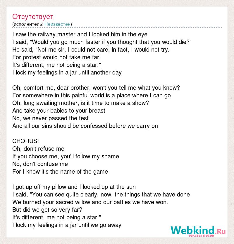 I saw the railway master and I looked him in the eye I said, "Would you go much faster if you thought that you would die?" He said, "Not me sir, I could not care, in fact, I would not try. For protest would not take me far. It's different, me not being a star." I lock my feelings in a jar until another day [bad word] me, dear brother, won't you tell me what you know? For somewhere in this painful world is a place where I can go Oh, long awaiting mother, is it time to make a show? And take your babies to your breast No, we never passed the test And all our sins should be confessed before we carry on [bad word] Oh, don't refuse me If you choose me, you'll follow my shame No, don't confuse me For I know it's the name of the game I got up off my pillow and I looked up at the sun I said, "You can see quite clearly, now, the things that we have done We burned your sacred willow and our battles we have won. But did we get so very far? It's different, me not being a star." I lock my feelings in a jar until we go away