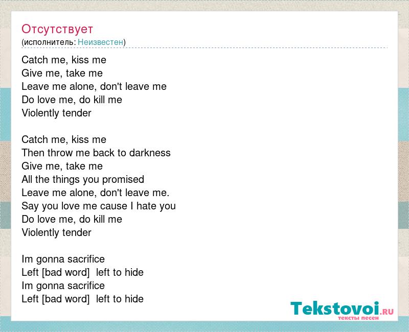 Catch me, kiss me Give me, take me Leave me alone, don't leave me Do love me, do kill me Violently tender Catch me, kiss me Then throw me back to darkness Give me, take me All the things you promised Leave me alone, don't leave me. Say you love me cause I hate you Do love me, do kill me Violently tender Im gonna sacrifice Left [bad word] left to hide Im gonna sacrifice Left [bad word] left to hide
