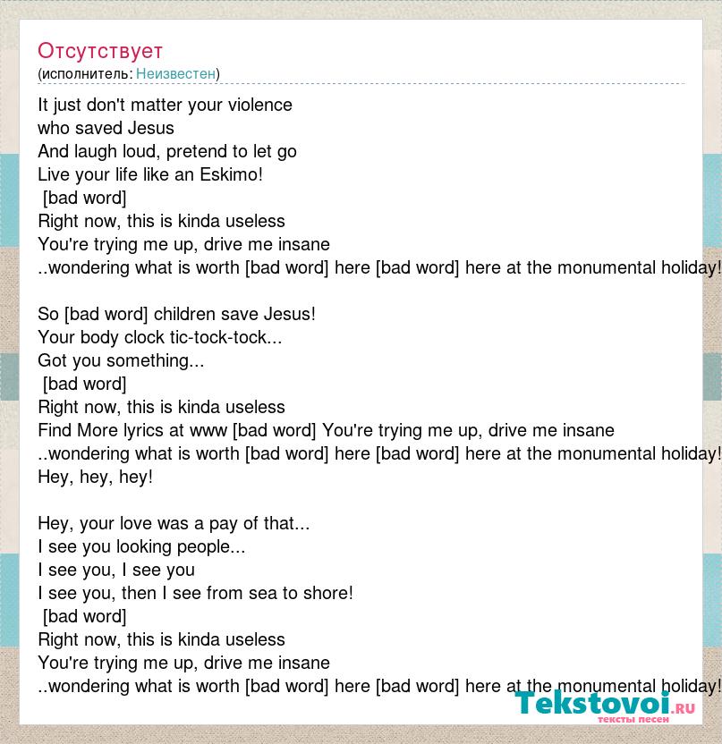 It just don't matter your violence who saved Jesus And laugh loud, pretend to let go Live your life like an Eskimo! [bad word] Right now, this is kinda useless You're trying me up, drive me insane ..wondering what is worth [bad word] here [bad word] here at the monumental holiday! So [bad word] children save Jesus! Your body clock tic-tock-tock... Got you something... [bad word] Right now, this is kinda useless Find More lyrics at www [bad word] You're trying me up, drive me insane ..wondering what is worth [bad word] here [bad word] here at the monumental holiday! Hey, hey, hey! Hey, your love was a pay of that... I see you looking people... I see you, I see you I see you, then I see from sea to shore! [bad word] Right now, this is kinda useless You're trying me up, drive me insane ..wondering what is worth [bad word] here [bad word] here at the monumental holiday!