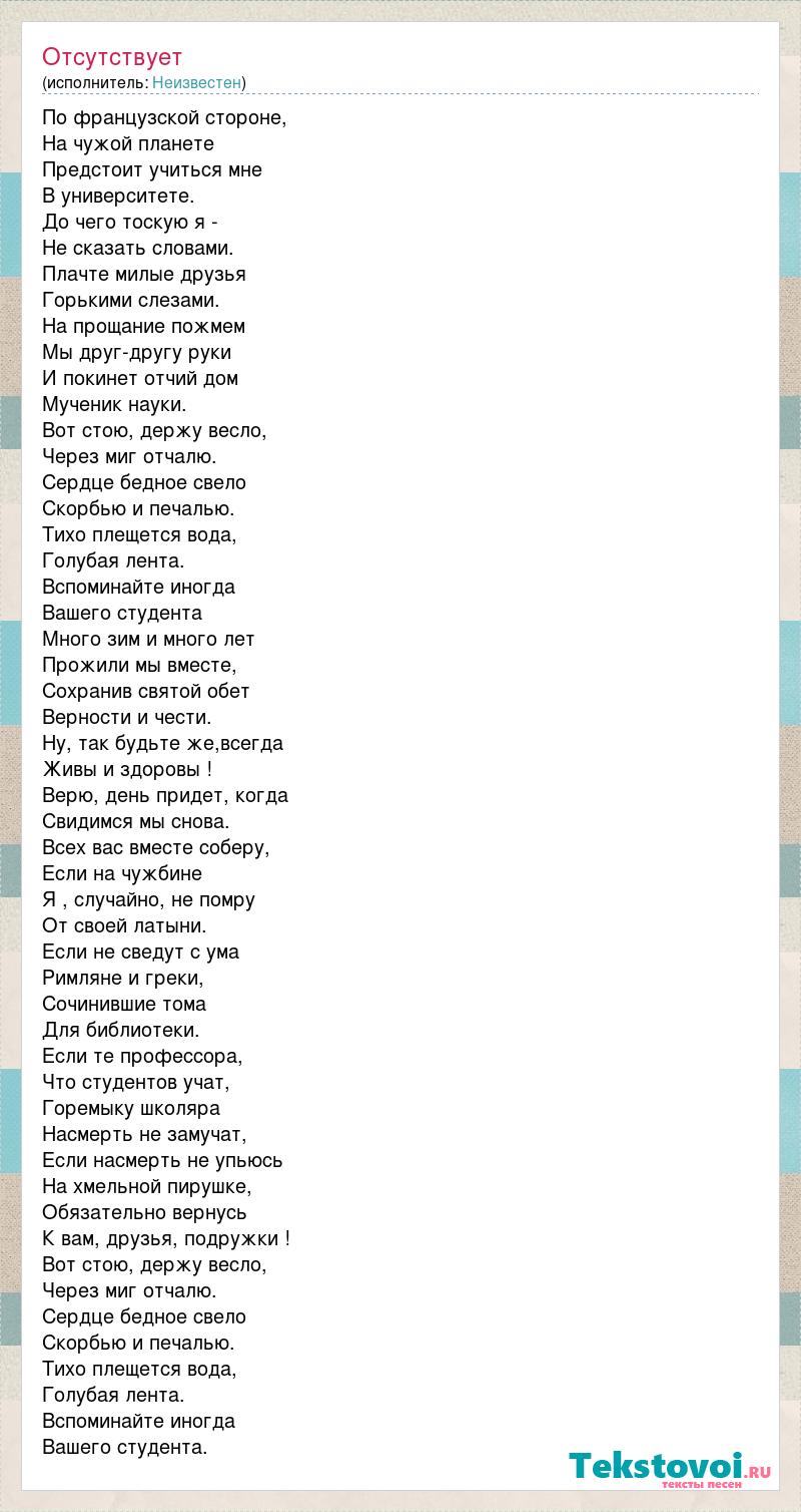 По французской стороне, На чужой планете Предстоит учиться мне В университете. До чего тоскую я - Не сказать словами. Плачте милые друзья Горькими слезами. На прощание пожмем Мы друг-другу руки И покинет отчий дом Мученик науки. Вот стою, держу весло, Через миг отчалю. Сердце бедное свело Скорбью и печалью. Тихо плещется вода, Голубая лента. Вспоминайте иногда Вашего студента Много зим и много лет Прожили мы вместе, Сохранив святой обет Верности и чести. Ну, так будьте же,всегда Живы и здоровы ! Верю, день придет, когда Свидимся мы снова. Всех вас вместе соберу, Если на чужбине Я , случайно, не помру От своей латыни. Если не сведут с ума Римляне и греки, Сочинившие тома Для библиотеки. Если те профессора, Что студентов учат, Горемыку школяра Насмерть не замучат, Если насмерть не упьюсь На хмельной пирушке, Обязательно вернусь К вам, друзья, подружки ! Вот стою, держу весло, Через миг отчалю. Сердце бедное свело Скорбью и печалью. Тихо плещется вода, Голубая лента. Вспоминайте иногда Вашего студента.