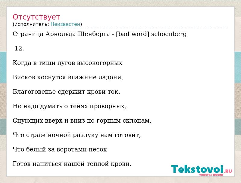 Страница Арнольда Шенберга - [bad word] schoenberg 12. Когда в тиши лугов высокогорных Висков коснутся влажные ладони, Благоговенье сдержит крови ток. Не надо думать о тенях проворных, Снующих вверх и вниз по горным склонам, Что страж ночной разлуку нам готовит, Что белый за воротами песок Готов напиться нашей теплой крови.