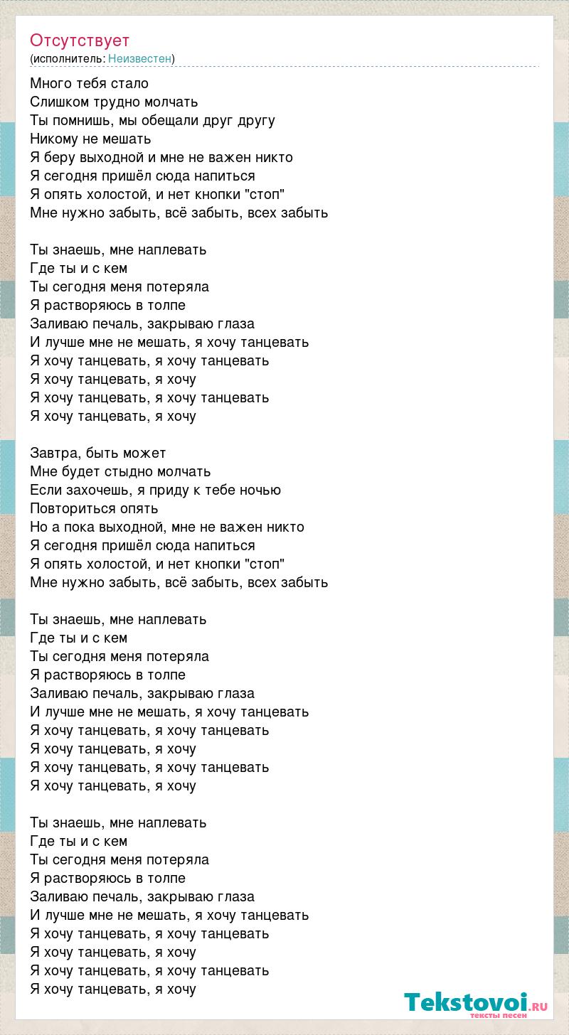 Много тебя стало Слишком трудно молчать Ты помнишь, мы обещали друг другу Никому не мешать Я беру выходной и мне не важен никто Я сегодня пришёл сюда напиться Я опять холостой, и нет кнопки "стоп" Мне нужно забыть, всё забыть, всех забыть Ты знаешь, мне наплевать Где ты и с кем Ты сегодня меня потеряла Я растворяюсь в толпе Заливаю печаль, закрываю глаза И лучше мне не мешать, я хочу танцевать Я хочу танцевать, я хочу танцевать Я хочу танцевать, я хочу Я хочу танцевать, я хочу танцевать Я хочу танцевать, я хочу Завтра, быть может Мне будет стыдно молчать Если захочешь, я приду к тебе ночью Повториться опять Но а пока выходной, мне не важен никто Я сегодня пришёл сюда напиться Я опять холостой, и нет кнопки "стоп" Мне нужно забыть, всё забыть, всех забыть Ты знаешь, мне наплевать Где ты и с кем Ты сегодня меня потеряла Я растворяюсь в толпе Заливаю печаль, закрываю глаза И лучше мне не мешать, я хочу танцевать Я хочу танцевать, я хочу танцевать Я хочу танцевать, я хочу Я хочу танцевать, я хочу танцевать Я хочу танцевать, я хочу Ты знаешь, мне наплевать Где ты и с кем Ты сегодня меня потеряла Я растворяюсь в толпе Заливаю печаль, закрываю глаза И лучше мне не мешать, я хочу танцевать Я хочу танцевать, я хочу танцевать Я хочу танцевать, я хочу Я хочу танцевать, я хочу танцевать Я хочу танцевать, я хочу
