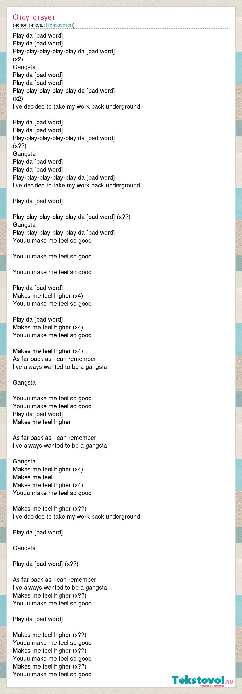 Play da [bad word] Play da [bad word] Play-play-play-play-play da [bad word] (x2) Gangsta Play da [bad word] Play da [bad word] Play-play-play-play-play da [bad word] (x2) I've decided to take my work back underground Play da [bad word] Play da [bad word] Play-play-play-play-play da [bad word] (x??) Gangsta Play da [bad word] Play da [bad word] Play-play-play-play-play da [bad word] I've decided to take my work back underground Play da [bad word] Play-play-play-play-play da [bad word] (x??) Gangsta Play-play-play-play-play da [bad word] Youuu make me feel so good Youuu make me feel so good Youuu make me feel so good Play da [bad word] Makes me feel higher (x4) Youuu make me feel so good Play da [bad word] Makes me feel higher (x4) Youuu make me feel so good Makes me feel higher (x4) As far back as I can remember I've always wanted to be a gangsta Gangsta Youuu make me feel so good Youuu make me feel so good Play da [bad word] Makes me feel higher As far back as I can remember I've always wanted to be a gangsta Gangsta Makes me feel higher (x4) Makes me feel Makes me feel higher (x4) Youuu make me feel so good Makes me feel higher (x??) I've decided to take my work back underground Play da [bad word] Gangsta Play da [bad word] (x??) As far back as I can remember I've always wanted to be a gangsta Makes me feel higher (x??) Youuu make me feel so good Play da [bad word] Makes me feel higher (x??) Youuu make me feel so good Makes me feel higher (x??) Youuu make me feel so good Makes me feel higher (x??) Youuu make me feel so good