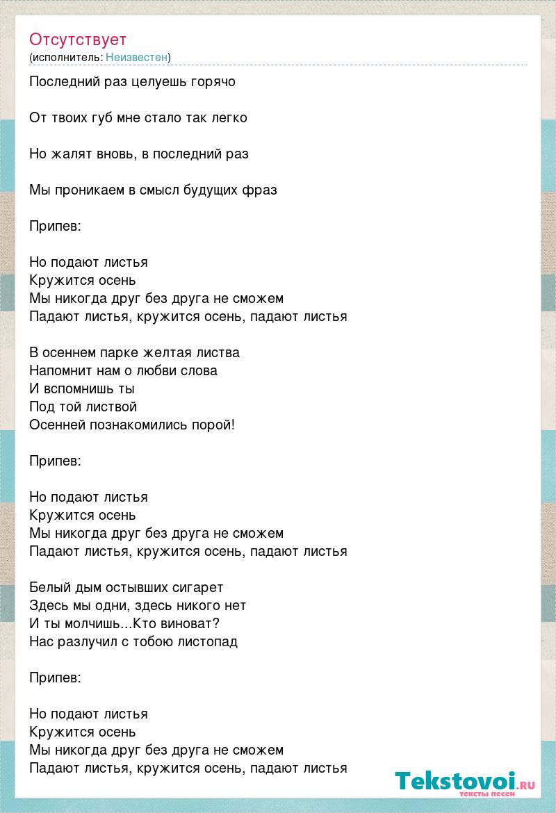 Последний раз целуешь горячо От твоих губ мне стало так легко Но жалят вновь, в последний раз Мы проникаем в смысл будущих фраз Припев: Но подают листья Кружится осень Мы никогда друг без друга не сможем Падают листья, кружится осень, падают листья В осеннем парке желтая листва Напомнит нам о любви слова И вспомнишь ты Под той листвой Осенней познакомились порой! Припев: Но подают листья Кружится осень Мы никогда друг без друга не сможем Падают листья, кружится осень, падают листья Белый дым остывших сигарет Здесь мы одни, здесь никого нет И ты молчишь...Кто виноват? Нас разлучил с тобою листопад Припев: Но подают листья Кружится осень Мы никогда друг без друга не сможем Падают листья, кружится осень, падают листья
