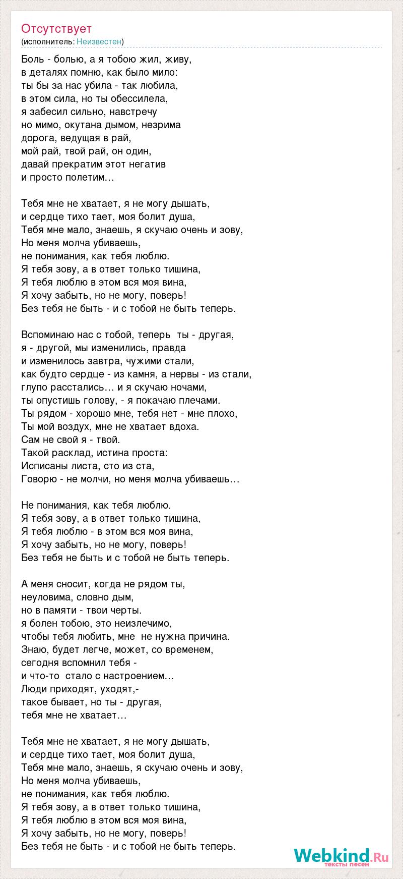 Боль - болью, а я тобою жил, живу, в деталях помню, как было мило: ты бы за нас убила - так любила, в этом сила, но ты обессилела, я забесил сильно, навстречу но мимо, окутана дымом, незрима дорога, ведущая в рай, мой рай, твой рай, он один, давай прекратим этот негатив и просто полетим… Тебя мне не хватает, я не могу дышать, и сердце тихо тает, моя болит душа, Тебя мне мало, знаешь, я скучаю очень и зову, Но меня молча убиваешь, не понимания, как тебя люблю. Я тебя зову, а в ответ только тишина, Я тебя люблю в этом вся моя вина, Я хочу забыть, но не могу, поверь! Без тебя не быть - и с тобой не быть теперь. Вспоминаю нас c тобой, теперь ты - другая, я - другой, мы изменились, правда и изменилось завтра, чужими стали, как будто сердце - из камня, а нервы - из стали, глупо расcтались… и я скучаю ночами, ты опустишь голову, - я покачаю плечами. Ты рядом - хорошо мне, тебя нет - мне плохо, Ты мой воздух, мне не хватает вдоха. Сам не свой я - твой. Такой расклад, истина проста: Исписаны листа, сто из ста, Говорю - не молчи, но меня молча убиваешь… Не понимания, как тебя люблю. Я тебя зову, а в ответ только тишина, Я тебя люблю - в этом вся моя вина, Я хочу забыть, но не могу, поверь! Без тебя не быть и с тобой не быть теперь. А меня сносит, когда не рядом ты, неуловима, словно дым, но в памяти - твои черты. я болен тобою, это неизлечимо, чтобы тебя любить, мне не нужна причина. Знаю, будет легче, может, со временем, сегодня вспомнил тебя - и что-то стало с настроением… Люди приходят, уходят,- такое бывает, но ты - другая, тебя мне не хватает… Тебя мне не хватает, я не могу дышать, и сердце тихо тает, моя болит душа, Тебя мне мало, знаешь, я скучаю очень и зову, Но меня молча убиваешь, не понимания, как тебя люблю. Я тебя зову, а в ответ только тишина, Я тебя люблю в этом вся моя вина, Я хочу забыть, но не могу, поверь! Без тебя не быть - и с тобой не быть теперь.