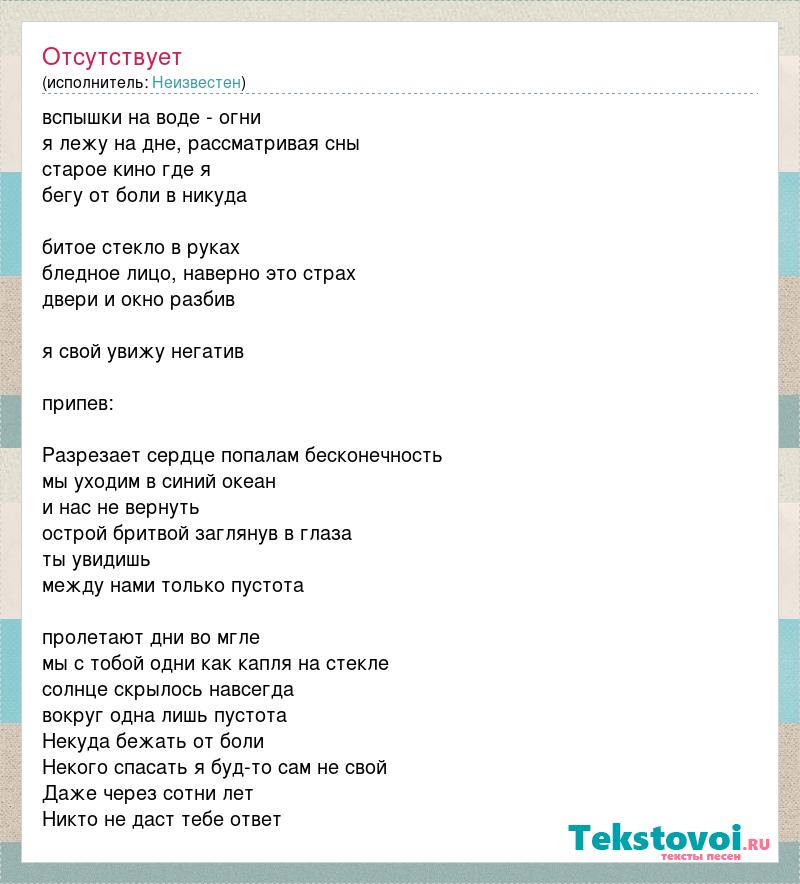 вспышки на воде - огни я лежу на дне, рассматривая сны старое кино где я бегу от боли в никуда битое стекло в руках бледное лицо, наверно это страх двери и окно разбив я свой увижу негатив припев: Разрезает сердце попалам бесконечность мы уходим в синий океан и нас не вернуть острой бритвой заглянув в глаза ты увидишь между нами только пустота пролетают дни во мгле мы с тобой одни как капля на стекле солнце скрылось навсегда вокруг одна лишь пустота Некуда бежать от боли Некого спасать я буд-то сам не свой Даже через сотни лет Никто не даст тебе ответ