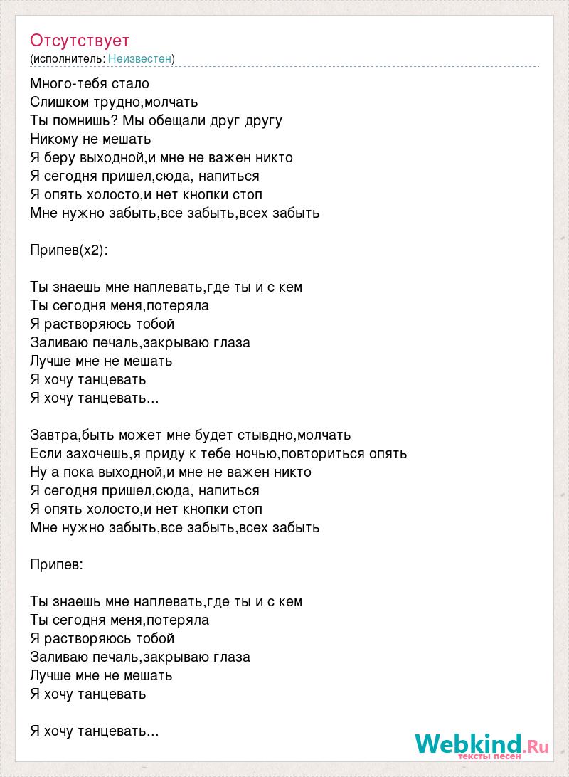 Много-тебя стало Слишком трудно,молчать Ты помнишь? Мы обещали друг другу Никому не мешать Я беру выходной,и мне не важен никто Я сегодня пришел,сюда, напиться Я опять холосто,и нет кнопки стоп Мне нужно забыть,все забыть,всех забыть Припев(х2): Ты знаешь мне наплевать,где ты и с кем Ты сегодня меня,потеряла Я растворяюсь тобой Заливаю печаль,закрываю глаза Лучше мне не мешать Я хочу танцевать Я хочу танцевать... Завтра,быть может мне будет стывдно,молчать Если захочешь,я приду к тебе ночью,повториться опять Ну а пока выходной,и мне не важен никто Я сегодня пришел,сюда, напиться Я опять холосто,и нет кнопки стоп Мне нужно забыть,все забыть,всех забыть Припев: Ты знаешь мне наплевать,где ты и с кем Ты сегодня меня,потеряла Я растворяюсь тобой Заливаю печаль,закрываю глаза Лучше мне не мешать Я хочу танцевать Я хочу танцевать...