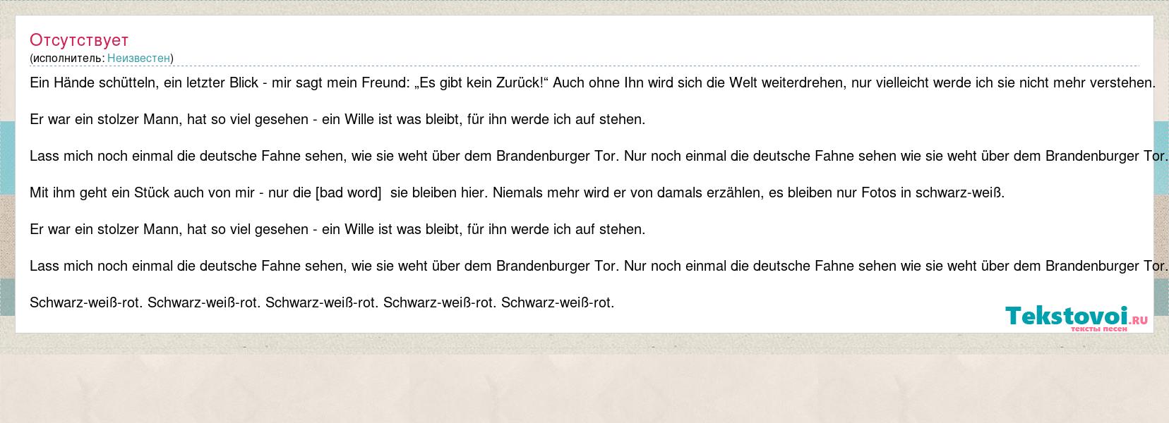 Ein Hände schütteln, ein letzter Blick - mir sagt mein Freund: „Es gibt kein Zurück!“ Auch ohne Ihn wird sich die Welt weiterdrehen, nur vielleicht werde ich sie nicht mehr verstehen. Er war ein stolzer Mann, hat so viel gesehen - ein Wille ist was bleibt, für ihn werde ich auf stehen. Lass mich noch einmal die deutsche Fahne sehen, wie sie weht über dem Brandenburger Tor. Nur noch einmal die deutsche Fahne sehen wie sie weht über dem Brandenburger Tor. Mit ihm geht ein Stück auch von mir - nur die [bad word] sie bleiben hier. Niemals mehr wird er von damals erzählen, es bleiben nur Fotos in schwarz-weiß. Er war ein stolzer Mann, hat so viel gesehen - ein Wille ist was bleibt, für ihn werde ich auf stehen. Lass mich noch einmal die deutsche Fahne sehen, wie sie weht über dem Brandenburger Tor. Nur noch einmal die deutsche Fahne sehen wie sie weht über dem Brandenburger Tor. Schwarz-weiß-rot. Schwarz-weiß-rot. Schwarz-weiß-rot. Schwarz-weiß-rot. Schwarz-weiß-rot.