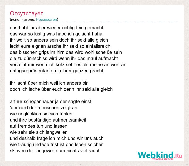 das habt ihr aber wieder richtig fein gemacht das war so lustig was habe ich gelacht haha ihr wollt so anders sein doch ihr seid alle gleich leckt eure eignen ärsche ihr seid so einfallsreich das bisschen grips im hirn das wird wohl scheiße sein die zu dünnschiss wird wenn ihr das maul aufmacht verzeiht mir wenn ich kotz seht es als meine antwort an unfugsrepräsentanten in ihrer ganzen pracht ihr lacht über mich weil ich anders bin doch ich lache über euch denn ihr seid alle gleich arthur schopenhauer ja der sagte einst: 'der neid der menschen zeigt an wie unglücklich sie sich fühlen und ihre beständige aufmerksamkeit auf fremdes tun und lassen wie sehr sie sich langweilen' und deshalb frage ich mich und wir uns auch wie traurig und wie trist ist das leben solcher sklaven der langeweile um nichts viel rauch