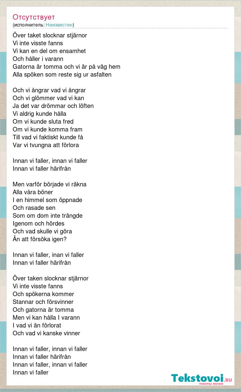 Över taket slocknar stjärnor Vi inte visste fanns Vi kan en del om ensamhet Och håller i varann Gatorna är tomma och vi är på väg hem Alla spöken som reste sig ur asfalten Och vi ångrar vad vi ångrar Och vi glömmer vad vi kan Ja det var drömmar och löften Vi aldrig kunde hålla Om vi kunde sluta fred Om vi kunde komma fram Till vad vi faktiskt kunde få Var vi tvungna att förlora Innan vi faller, innan vi faller Innan vi faller härifrån Men varför började vi räkna Alla våra böner I en himmel som öppnade Och rasade sen Som om dom inte trängde Igenom och hördes Och vad skulle vi göra Än att försöka igen? Innan vi faller, inan vi faller Innan vi faller härifrån Över taken slocknar stjärnor Vi inte visste fanns Och spökerna kommer Stannar och försvinner Och gatorna är tomma Men vi kan hålla I varann I vad vi än förlorat Och vad vi kanske vinner Innan vi faller, innan vi faller Innan vi faller härifrån Innan vi faller, innan vi faller Innan vi faller