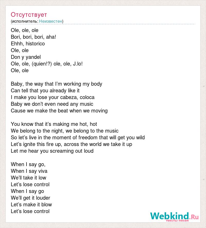 Ole, ole, ole Bori, bori, bori, aha! Ehhh, historico Ole, ole Don y yandel Ole, ole, (quien!?) ole, ole, J.lo! Ole, ole Baby, the way that I’m working my body Can tell that you already like it I make you lose your cabeza, coloca Baby we don’t even need any music Cause we make the beat when we moving You know that it’s making me hot, hot We belong to the night, we belong to the music So let’s live in the moment of freedom that will get you wild Let’s ignite this fire up, across the world we take it up Let me hear you screaming out loud When I say go, When I say viva We’ll take it low Let’s lose control When I say go We’ll get it louder Let’s make it blow Let’s lose control