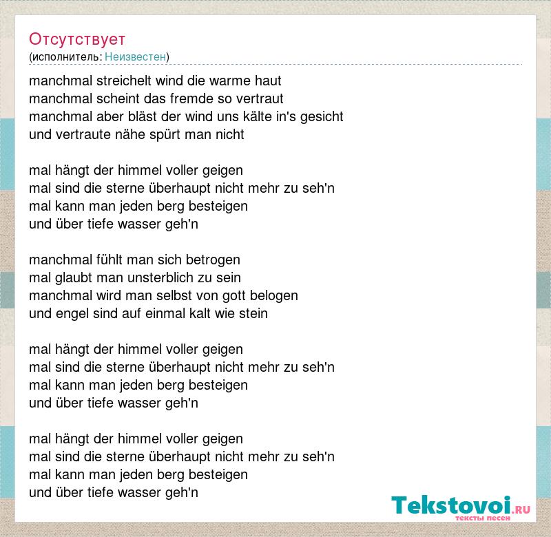manchmal streichelt wind die warme haut manchmal scheint das fremde so vertraut manchmal aber bläst der wind uns kälte in's gesicht und vertraute nähe spürt man nicht mal hängt der himmel voller geigen mal sind die sterne überhaupt nicht mehr zu seh'n mal kann man jeden berg besteigen und über tiefe wasser geh'n manchmal fühlt man sich betrogen mal glaubt man unsterblich zu sein manchmal wird man selbst von gott belogen und engel sind auf einmal kalt wie stein mal hängt der himmel voller geigen mal sind die sterne überhaupt nicht mehr zu seh'n mal kann man jeden berg besteigen und über tiefe wasser geh'n mal hängt der himmel voller geigen mal sind die sterne überhaupt nicht mehr zu seh'n mal kann man jeden berg besteigen und über tiefe wasser geh'n