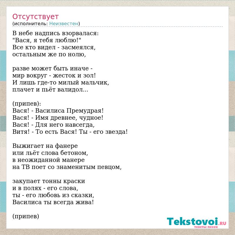 В небе надпись взорвалася: "Вася, я тебя люблю!" Все кто видел - засмеялся, остальным же по нолю, разве может быть иначе - мир вокруг - жесток и зол! И лишь где-то милый мальчик, плачет и пьёт валидол... (припев): Вася! - Василиса Премудрая! Вася! - Имя древнее, чудное! Вася! - Для него навсегда, Витя! - То есть Вася! Ты - его звезда! Выжигает на фанере или льёт слова бетоном, в неожиданной манере на ТВ поет со знаменитым певцом, закупает тонны краски и в полях - его слова, ты - его любовь из сказки, Василиса ты всегда жива! (припев)