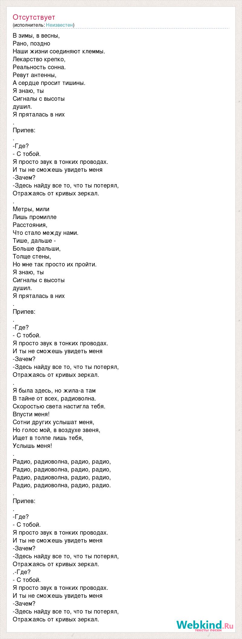 В зимы, в весны, Рано, поздно Наши жизни соединяют клеммы. Лекарство крепко, Реальность сонна. Ревут антенны, А сердце просит тишины. Я знаю, ты Сигналы с высоты душил. Я пряталась в них . Припев: . -Где? - С тобой. Я просто звук в тонких проводах. И ты не сможешь увидеть меня -Зачем? -Здесь найду все то, что ты потерял, Отражаясь от кривых зеркал. . Метры, мили Лишь промилле Расстояния, Что стало между нами. Тише, дальше - Больше фальши, Толще стены, Но мне так просто их пройти. Я знаю, ты Сигналы с высоты душил. Я пряталась в них . Припев: . -Где? - С тобой. Я просто звук в тонких проводах. И ты не сможешь увидеть меня -Зачем? -Здесь найду все то, что ты потерял, Отражаясь от кривых зеркал. . Я была здесь, но жила-а там В тайне от всех, радиоволна. Скоростью света настигла тебя. Впусти меня! Сотни других услышат меня, Но голос мой, в воздухе звеня, Ищет в толпе лишь тебя, Услышь меня! . Радио, радиоволна, радио, радио, Радио, радиоволна, радио, радио, Радио, радиоволна, радио, радио, Радио, радиоволна, радио, радио. . Припев: . -Где? - С тобой. Я просто звук в тонких проводах. И ты не сможешь увидеть меня -Зачем? -Здесь найду все то, что ты потерял, Отражаясь от кривых зеркал. .-Где? - С тобой. Я просто звук в тонких проводах. И ты не сможешь увидеть меня -Зачем? -Здесь найду все то, что ты потерял, Отражаясь от кривых зеркал.