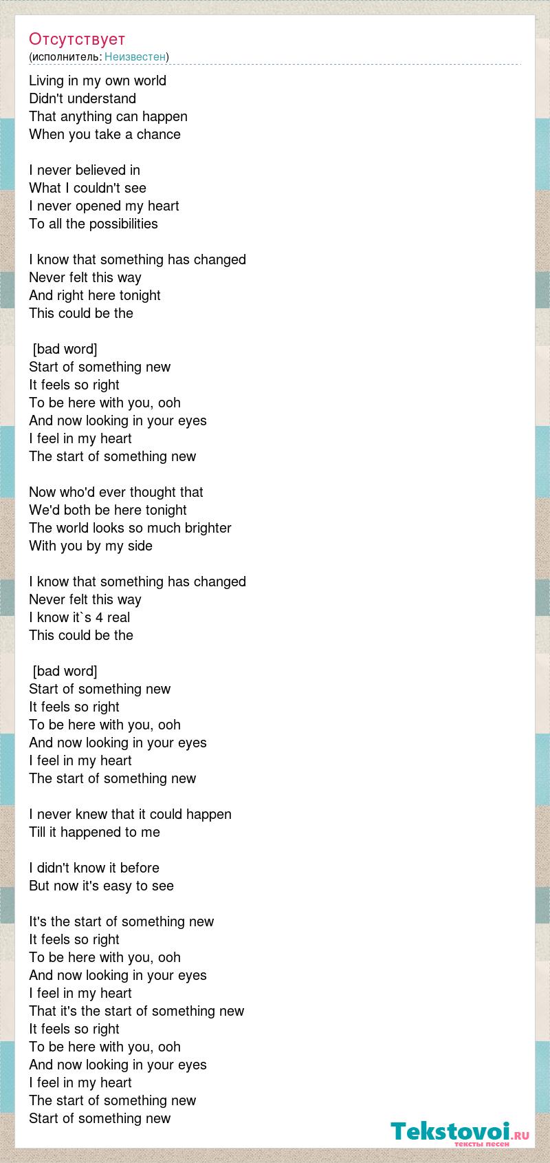 Living in my own world Didn't understand That anything can happen When you take a chance I never believed in What I couldn't see I never opened my heart To all the possibilities I know that something has changed Never felt this way And right here tonight This could be the [bad word] Start of something new It feels so right To be here with you, ooh And now looking in your eyes I feel in my heart The start of something new Now who'd ever thought that We'd both be here tonight The world looks so much brighter With you by my side I know that something has changed Never felt this way I know it`s 4 real This could be the [bad word] Start of something new It feels so right To be here with you, ooh And now looking in your eyes I feel in my heart The start of something new I never knew that it could happen Till it happened to me I didn't know it before But now it's easy to see It's the start of something new It feels so right To be here with you, ooh And now looking in your eyes I feel in my heart That it's the start of something new It feels so right To be here with you, ooh And now looking in your eyes I feel in my heart The start of something new Start of something new