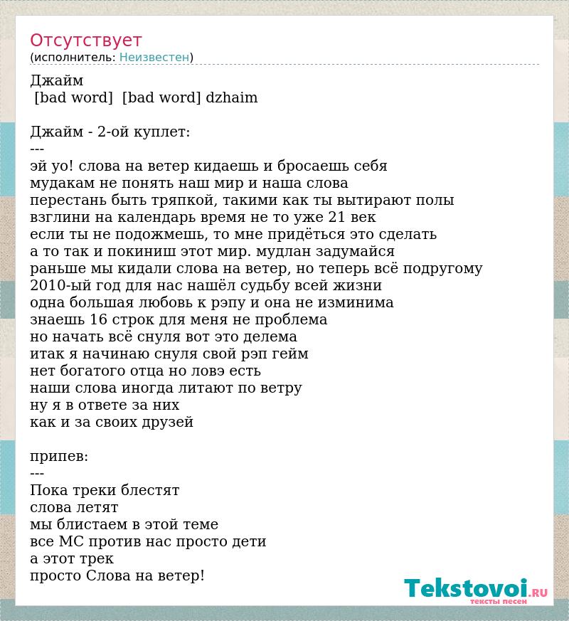 Джайм [bad word] [bad word] dzhaim Джайм - 2-ой куплет: --- эй yo! слова на ветер кидаешь и бросаешь себя мудакам не понять наш мир и наша слова перестань быть тряпкой, такими как ты вытирают полы взглини на календарь время не то уже 21 век если ты не подожмешь, то мне придёться это сделать а то так и покиниш этот мир. мудлан задумайся раньше мы кидали слова на ветер, но теперь всё подругому 2010-ый год для нас нашёл судьбу всей жизни одна большая любовь к рэпу и она не изминима знаешь 16 строк для меня не проблема но начать всё снуля вот это делема итак я начинаю снуля свой рэп гейм нет богатого отца но ловэ есть наши слова иногда литают по ветру ну я в ответе за них как и за своих друзей припев: --- Пока треки блестят слова летят мы блистаем в этой теме все МС против нас просто дети а этот трек просто Слова на ветер!