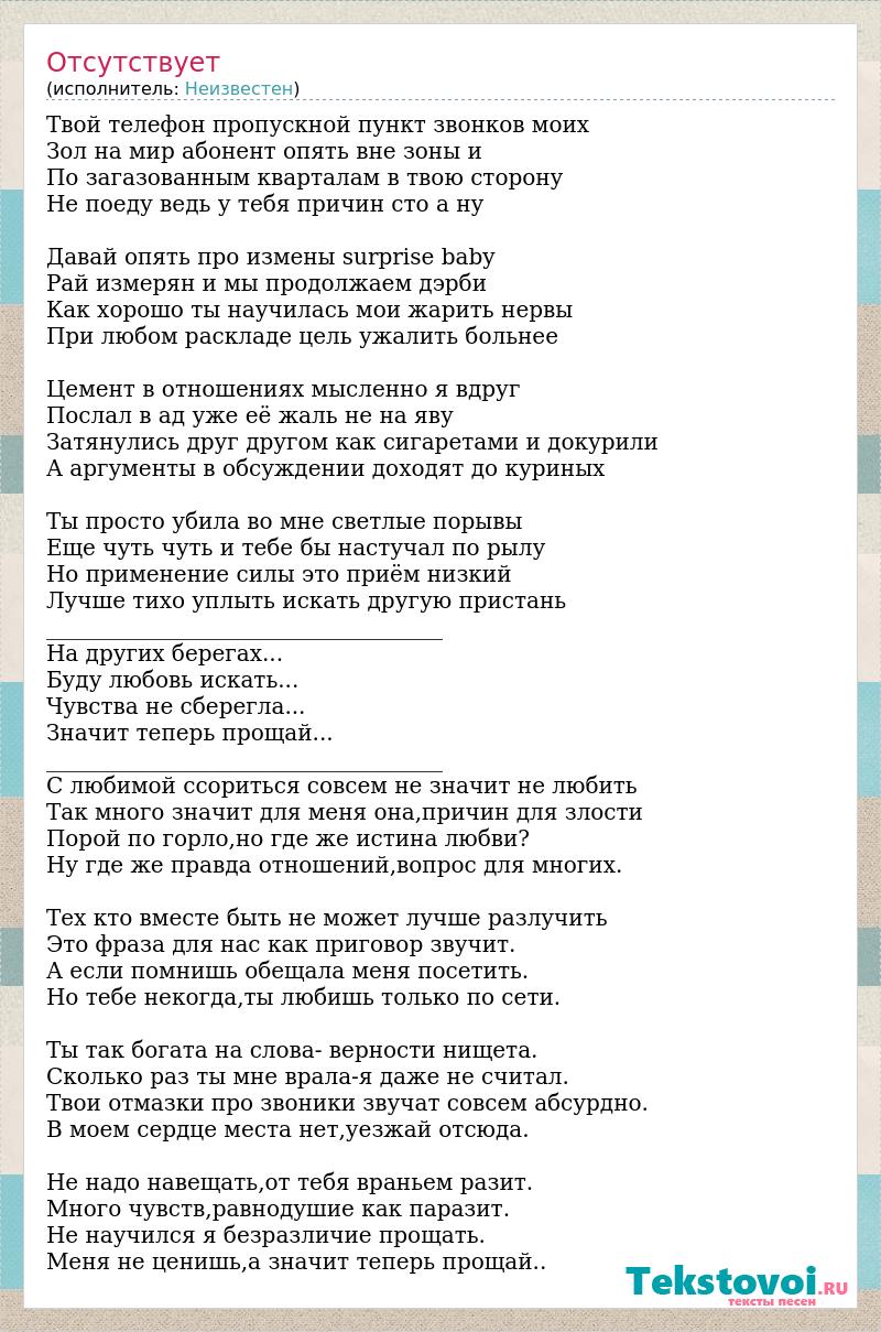 Твой телефон пропускной пункт звонков моих Зол на мир абонент опять вне зоны и По загазованным кварталам в твою сторону Не поеду ведь у тебя причин сто а ну Давай опять про измены surprise baby Рай измерян и мы продолжаем дэрби Как хорошо ты научилась мои жарить нервы При любом раскладе цель ужалить больнее Цемент в отношениях мысленно я вдруг Послал в ад уже её жаль не на яву Затянулись друг другом как сигаретами и докурили А аргументы в обсуждении доходят до куриных Ты просто убила во мне светлые порывы Еще чуть чуть и тебе бы настучал по рылу Но применение силы это приём низкий Лучше тихо уплыть искать другую пристань ____________________________________ На других берегах... Буду любовь искать... Чувства не сберегла... Значит теперь прощай... ____________________________________ С любимой ссориться совсем не значит не любить Так много значит для меня она,причин для злости Порой по горло,но где же истина любви? Ну где же правда отношений,вопрос для многих. Тех кто вместе быть не может лучше разлучить Это фраза для нас как приговор звучит. А если помнишь обещала меня посетить. Но тебе некогда,ты любишь только по сети. Ты так богата на слова- верности нищета. Сколько раз ты мне врала-я даже не считал. Твои отмазки про звоники звучат совсем абсурдно. В моем сердце места нет,уезжай отсюда. Не надо навещать,от тебя враньем разит. Много чувств,равнодушие как паразит. Не научился я безразличие прощать. Меня не ценишь,а значит теперь прощай..