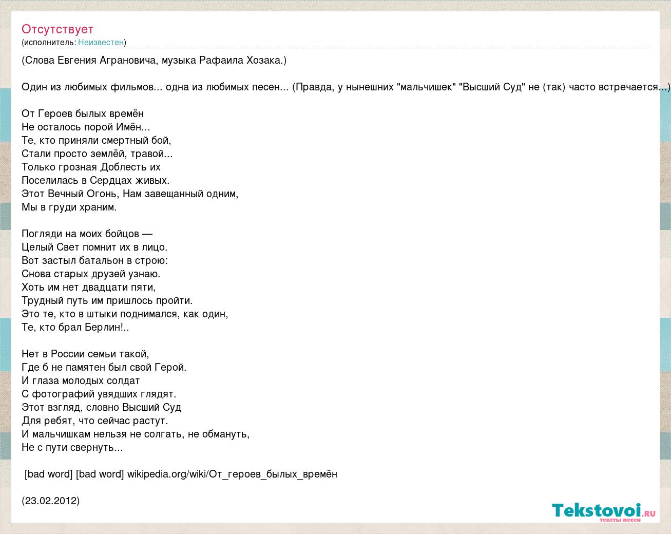 (Слова Евгения Аграновича, музыка Рафаила Хозака.) Один из любимых фильмов... одна из любимых песен... (Правда, у нынешних "мальчишек" "Высший Суд" не (так) часто встречается...) От Героев былых времён Не осталось порой Имён... Те, кто приняли смертный бой, Стали просто землёй, травой... Только грозная Доблесть их Поселилась в Сердцах живых. Этот Вечный Огонь, Нам завещанный одним, Мы в груди храним. Погляди на моих бойцов — Целый Свет помнит их в лицо. Вот застыл батальон в строю: Снова старых друзей узнаю. Хоть им нет двадцати пяти, Трудный путь им пришлось пройти. Это те, кто в штыки поднимался, как один, Те, кто брал Берлин!.. Нет в России семьи такой, Где б не памятен был свой Герой. И глаза молодых солдат С фотографий увядших глядят. Этот взгляд, словно Высший Суд Для ребят, что сейчас растут. И мальчишкам нельзя не солгать, не обмануть, Не с пути свернуть... [bad word] [bad word] wikipedia.org/wiki/От_героев_былых_времён (23.02.2012)