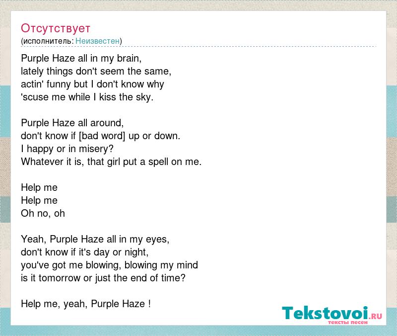 Purple Haze all in my brain, lately things don't seem the same, actin' funny but I don't know why 'scuse me while I kiss the sky. Purple Haze all around, don't know if [bad word] up or down. I happy or in misery? Whatever it is, that girl put a spell on me. Help me Help me Oh no, oh Yeah, Purple Haze all in my eyes, don't know if it's day or night, you've got me blowing, blowing my mind is it tomorrow or just the end of time? Help me, yeah, Purple Haze !