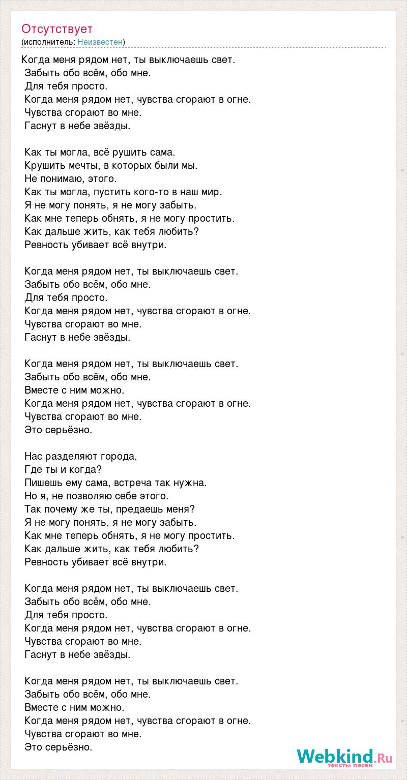 Когда меня рядом нет, ты выключаешь свет. Забыть обо всём, обо мне. Для тебя просто. Когда меня рядом нет, чувства сгорают в огне. Чувства сгорают во мне. Гаснут в небе звёзды. Как ты могла, всё рушить сама. Крушить мечты, в которых были мы. Не понимаю, этого. Как ты могла, пустить кого-то в наш мир. Я не могу понять, я не могу забыть. Как мне теперь обнять, я не могу простить. Как дальше жить, как тебя любить? Ревность убивает всё внутри. Когда меня рядом нет, ты выключаешь свет. Забыть обо всём, обо мне. Для тебя просто. Когда меня рядом нет, чувства сгорают в огне. Чувства сгорают во мне. Гаснут в небе звёзды. Когда меня рядом нет, ты выключаешь свет. Забыть обо всём, обо мне. Вместе с ним можно. Когда меня рядом нет, чувства сгорают в огне. Чувства сгорают во мне. Это серьёзно. Нас разделяют города, Где ты и когда? Пишешь ему сама, встреча так нужна. Но я, не позволяю себе этого. Так почему же ты, предаешь меня? Я не могу понять, я не могу забыть. Как мне теперь обнять, я не могу простить. Как дальше жить, как тебя любить? Ревность убивает всё внутри. Когда меня рядом нет, ты выключаешь свет. Забыть обо всём, обо мне. Для тебя просто. Когда меня рядом нет, чувства сгорают в огне. Чувства сгорают во мне. Гаснут в небе звёзды. Когда меня рядом нет, ты выключаешь свет. Забыть обо всём, обо мне. Вместе с ним можно. Когда меня рядом нет, чувства сгорают в огне. Чувства сгорают во мне. Это серьёзно.