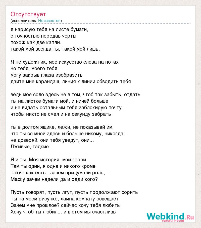 я нарисую тебя на листе бумаги, с точностью передав черты похож как две капли. такой мой всегда ты. такой мой лишь. Я не художник, мое искусство слова на нотах но тебя, моего тебя могу закрыв глаза изобразить дайте мне карандаш, линия к линии обводить тебя ведь мое соло здесь не в том, чтоб так забыть, отдать ты на листке бумаги мой, и ничей больше и не видать остальным тебя заблокирую почту чтобы никто не смел и на секунду забрать ты в долгом ящике, лежи, не показывай им, что ты со мной здесь и больше никому, никогда не доверяй. они тебя уведут, они... Лживые, гадкие Я и ты. Моя история, мои герои Там ты один, я одна и никого кроме Такие как есть...зачем придумали роль, Маску зачем надели да и ради кого? Пусть говорят, пусть лгут, пусть продолжают сорить Ты на моем рисунке, лампа комнату освещает Зачем мне прошлое? сейчас хочу тебя любить Хочу чтоб ты любил... и в этом мы счастливы