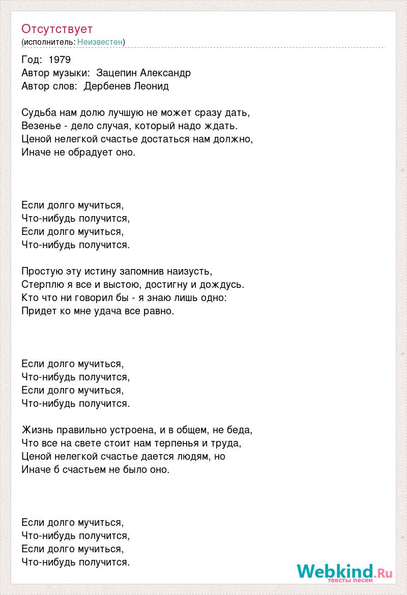 Год: 1979 Автор музыки: Зацепин Александр Автор слов: Дербенев Леонид Судьба нам долю лучшую не может сразу дать, Везенье - дело случая, который надо ждать. Ценой нелегкой счастье достаться нам должно, Иначе не обрадует оно. Если долго мучиться, Что-нибудь получится, Если долго мучиться, Что-нибудь получится. Простую эту истину запомнив наизусть, Стерплю я все и выстою, достигну и дождусь. Кто что ни говорил бы - я знаю лишь одно: Придет ко мне удача все равно. Если долго мучиться, Что-нибудь получится, Если долго мучиться, Что-нибудь получится. Жизнь правильно устроена, и в общем, не беда, Что все на свете стоит нам терпенья и труда, Ценой нелегкой счастье дается людям, но Иначе б счастьем не было оно. Если долго мучиться, Что-нибудь получится, Если долго мучиться, Что-нибудь получится.