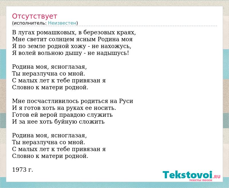 В лугах ромашковых, в березовых краях, Мне светит солнцем ясным Родина моя Я по земле родной хожу - не нахожусь, Я волей вольною дышу - не надышусь! Родина моя, ясноглазая, Ты неразлучна со мной. С малых лет к тебе привязан я Словно к матери родной. Мне посчастливилось родиться на Руси И я готов хоть на руках ее носить. Готов ей верой правдою служить И за нее хоть буйную сложить Родина моя, ясноглазая, Ты неразлучна со мной. С малых лет к тебе привязан я Словно к матери родной. 1973 г.