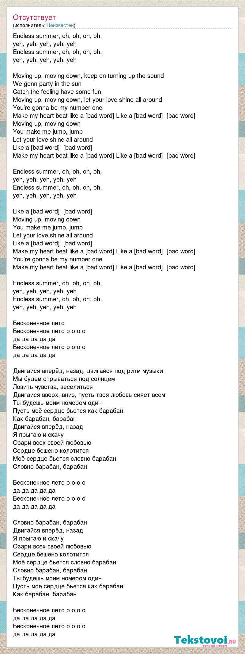 Endless summer, oh, oh, oh, oh, yeh, yeh, yeh, yeh, yeh Endless summer, oh, oh, oh, oh, yeh, yeh, yeh, yeh, yeh Moving up, moving down, keep on turning up the sound We gonn party in the sun Catch the feeling have some fun Moving up, moving down, let your love shine all around You’re gonna be my number one Make my heart beat like a [bad word] Like a [bad word] [bad word] Moving up, moving down You make me jump, jump Let your love shine all around Like a [bad word] [bad word] Make my heart beat like a [bad word] Like a [bad word] [bad word] Endless summer, oh, oh, oh, oh, yeh, yeh, yeh, yeh, yeh Endless summer, oh, oh, oh, oh, yeh, yeh, yeh, yeh, yeh Like a [bad word] [bad word] Moving up, moving down You make me jump, jump Let your love shine all around Like a [bad word] [bad word] Make my heart beat like a [bad word] Like a [bad word] [bad word] You’re gonna be my number one Make my heart beat like a [bad word] Like a [bad word] [bad word] Endless summer, oh, oh, oh, oh, yeh, yeh, yeh, yeh, yeh Endless summer, oh, oh, oh, oh, yeh, yeh, yeh, yeh, yeh Бесконечное лето Бесконечное лето о о о о да да да да да Бесконечное лето о о о о да да да да да Двигайся вперёд, назад, двигайся под ритм музыки Мы будем отрываться под солнцем Ловить чувства, веселиться Двигайся вверх, вниз, пусть твоя любовь сияет всем Ты будешь моим номером один Пусть моё сердце бьется как барабан Как барабан, барабан Двигайся вперёд, назад Я прыгаю и скачу Озари всех своей любовью Сердце бешено колотится Моё сердце бьется словно барабан Словно барабан, барабан Бесконечное лето о о о о да да да да да Бесконечное лето о о о о да да да да да Словно барабан, барабан Двигайся вперёд, назад Я прыгаю и скачу Озари всех своей любовью Сердце бешено колотится Моё сердце бьется словно барабан Словно барабан, барабан Ты будешь моим номером один Пусть моё сердце бьется как барабан Как барабан, барабан Бесконечное лето о о о о да да да да да Бесконечное лето о о о о да да да да да
