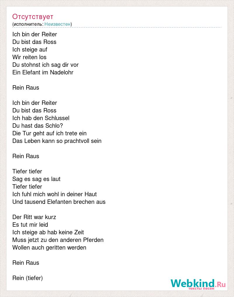 Ich bin der Reiter Du bist das Ross Ich steige auf Wir reiten los Du stohnst ich sag dir vor Ein Elefant im Nadelohr Rein Raus Ich bin der Reiter Du bist das Ross Ich hab den Schlussel Du hast das Schlo? Die Tur geht auf ich trete ein Das Leben kann so prachtvoll sein Rein Raus Tiefer tiefer Sag es sag es laut Tiefer tiefer Ich fuhl mich wohl in deiner Haut Und tausend Elefanten brechen aus Der Ritt war kurz Es tut mir leid Ich steige ab hab keine Zeit Muss jetzt zu den anderen Pferden Wollen auch geritten werden Rein Raus Rein (tiefer)