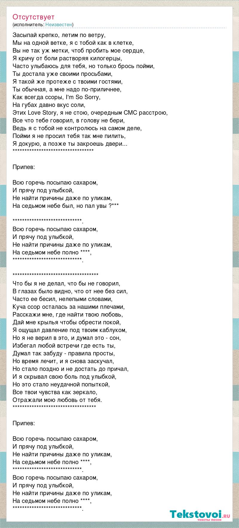 Засыпай крепко, летим по ветру, Мы на одной ветке, я с тобой как в клетке, Вы не так уж метки, чтоб пробить мое сердце, Я кричу от боли растворяя килогерцы, Часто улыбаюсь для тебя, но только брось пойми, Ты достала уже своими просьбами, Я такой же протеже с твоими гостями, Ты обычная, а мне надо по-приличнее, Как всегда ссоры, I'm So Sorry, На губах давно вкус соли, Этих Love Story, я не стою, очередным СМС расстрою, Все что тебе говорил, в голову не бери, Ведь я с тобой не контролюсь на самом деле, Пойми я не просил тебя так мне пилить, Я докурю, а позже ты закроешь двери... ********************************** Припев: Всю горечь посыпаю сахаром, И прячу под улыбкой, Не найти причины даже по уликам, На седьмом небе был, но пал увы ?*** *****************************. Всю горечь посыпаю сахаром, И прячу под улыбкой, Не найти причины даже по уликам, На седьмом небе полно ****, *****************************. ************************************ Что бы я не делал, что бы не говорил, В глазах было видно, что от нее без сил, Часто ее бесил, нелепыми словами, Куча ссор осталась за нашими плечами, Расскажи мне, где найти твою любовь, Дай мне крылья чтобы обрести покой, Я ощущал давление под твоим каблуком, Но я не верил в это, и думал это - сон, Избегал любой встречи где есть ты, Думал так забуду - правила просты, Но время лечит, и я снова заскучал, Но стало поздно и не достать до причал, И я скрывал свою боль под улыбкой, Но это стало неудачной попыткой, Все твои чувства как зеркало, Отражали мою любовь от тебя. *********************************** Припев: Всю горечь посыпаю сахаром, И прячу под улыбкой, Не найти причины даже по уликам, На седьмом небе полно ****, *****************************. Всю горечь посыпаю сахаром, И прячу под улыбкой, Не найти причины даже по уликам, На седьмом небе полно ****, *****************************.