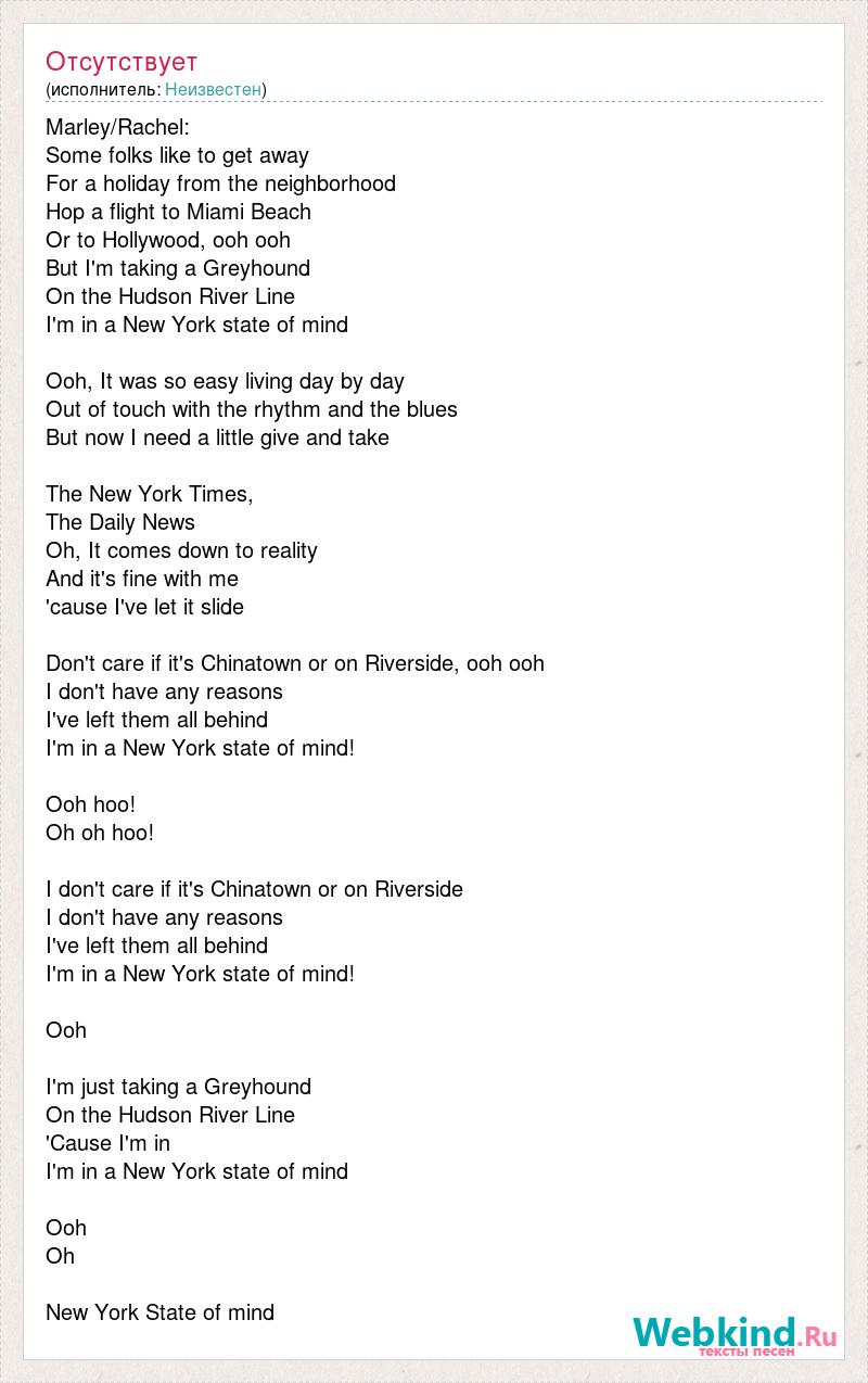 Marley/Rachel: Some folks like to get away For a holiday from the neighborhood Hop a flight to Miami Beach Or to Hollywood, ooh ooh But I'm taking a Greyhound On the Hudson River Line I'm in a New York state of mind Ooh, It was so easy living day by day Out of touch with the rhythm and the blues But now I need a little give and take The New York Times, The Daily News Oh, [bad word] down to reality And it's fine with me 'cause I've let it slide Don't care if it's Chinatown or on Riverside, ooh ooh I don't have any reasons I've left them all behind I'm in a New York state of mind! Ooh hoo! Oh oh hoo! I don't care if it's Chinatown or on Riverside I don't have any reasons I've left them all behind I'm in a New York state of mind! Ooh I'm just taking a Greyhound On the Hudson River Line 'Cause I'm in I'm in a New York state of mind Ooh Oh New York State of mind