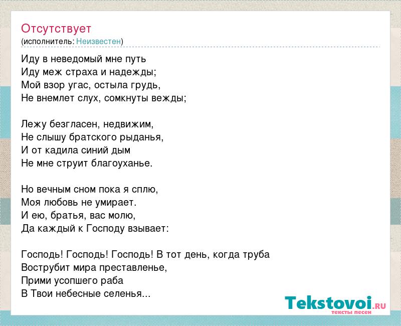 Иду в неведомый мне путь Иду меж страха и надежды; Мой взор угас, остыла грудь, Не внемлет слух, сомкнуты вежды; Лежу безгласен, недвижим, Не слышу братского рыданья, И от кадила синий дым Не мне струит благоуханье. Но вечным сном пока я сплю, Моя любовь не умирает. И ею, братья, вас молю, Да каждый к Господу взывает: Господь! Господь! Господь! В тот день, когда труба Вострубит мира преставленье, Прими усопшего раба В Твои небесные селенья...
