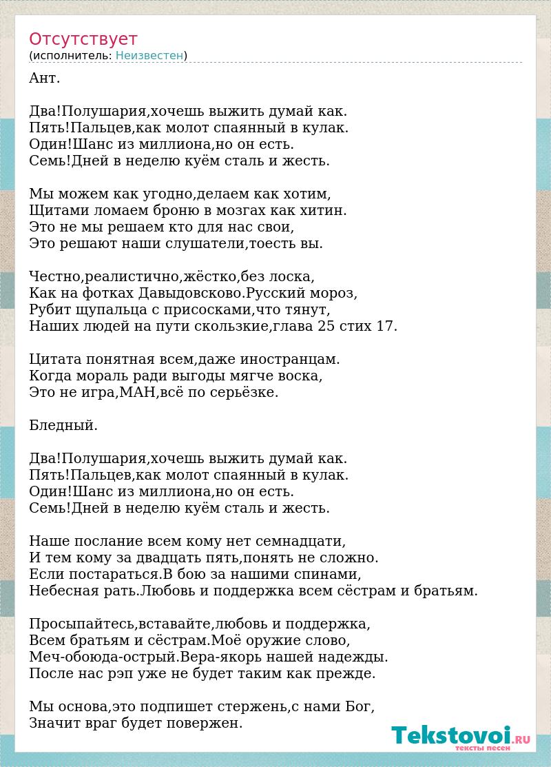 Ант. Два!Полушария,хочешь выжить думай как. Пять!Пальцев,как молот спаянный в кулак. Один!Шанс из миллиона,но он есть. Семь!Дней в неделю куём сталь и жесть. Мы можем как угодно,делаем как хотим, Щитами ломаем броню в мозгах как хитин. Это не мы решаем кто для нас свои, Это решают наши слушатели,тоесть вы. Честно,реалистично,жёстко,без лоска, Как на фотках Давыдовсково.Русский мороз, Рубит щупальца с присосками,что тянут, Наших людей на пути скользкие,глава 25 стих 17. Цитата понятная всем,даже иностранцам. Когда мораль ради выгоды мягче воска, Это не игра,МАН,всё по серьёзке. Бледный. Два!Полушария,хочешь выжить думай как. Пять!Пальцев,как молот спаянный в кулак. Один!Шанс из миллиона,но он есть. Семь!Дней в неделю куём сталь и жесть. Наше послание всем кому нет семнадцати, И тем кому за двадцать пять,понять не сложно. Если постараться.В бою за нашими спинами, Небесная рать.Любовь и поддержка всем сёстрам и братьям. Просыпайтесь,вставайте,любовь и поддержка, Всем братьям и сёстрам.Моё оружие слово, Меч-обоюда-острый.Вера-якорь нашей надежды. После нас рэп уже не будет таким как прежде. Мы основа,это подпишет стержень,с нами Бог, Значит враг будет повержен.