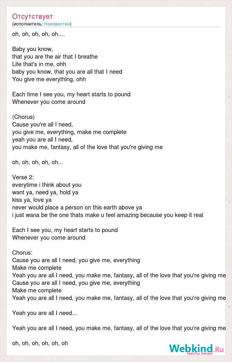 oh, oh, oh, oh, oh.... Baby you know, that you are the air that I breathe Life that's in me, ohh baby you know, that you are all that I need You give me everything, ohh Each time I see you, my heart starts to pound Whenever [bad word] around [bad word] Cause you're all I need, you give me, everything, make [bad word] yeah you are all I need, you make me, fantasy, all of the love that you're giving me oh, oh, oh, oh, oh... Verse 2: everytime i think about you want ya, need ya, hold ya kiss ya, love ya never would place a person on this earth above ya i just wana be the one thats make u feel amazing because you keep it real Each I see you, my heart starts to pound Whenever [bad word] around [bad word] Cause you are all I need, you give me, everything Make [bad word] Yeah you are all I need, you make me, fantasy, all of the love that you're giving me Cause you are all I need, you give me, everything Make [bad word] Yeah you are all I need, you make me, fantasy, all of the love that you're giving me Yeah you are all I need... Yeah you are all I need, you make me, fantasy, all of the love that you're giving me oh, oh, oh, oh, oh, oh