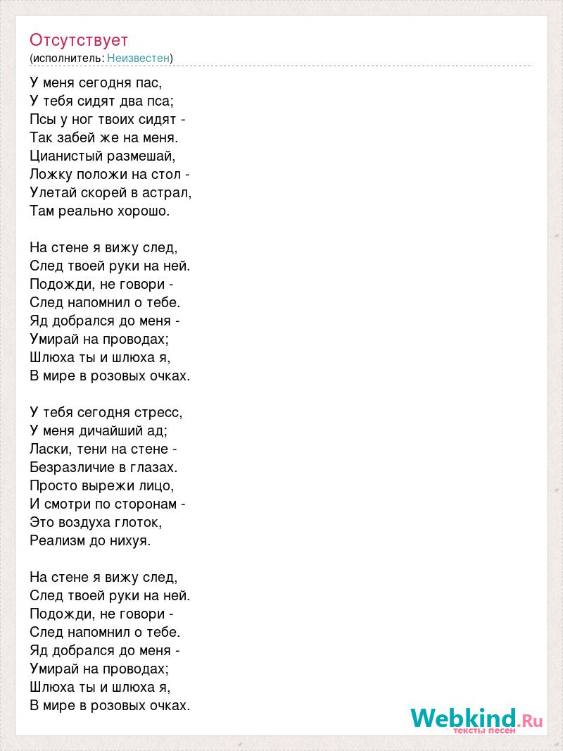 У меня сегодня пас, У тебя сидят два пса; Псы у ног твоих сидят - Так забей же на меня. Цианистый размешай, Ложку положи на стол - Улетай скорей в астрал, Там реально хорошо. На стене я вижу след, След твоей руки на ней. Подожди, не говори - След напомнил о тебе. Яд добрался до меня - Умирай на проводах; Шлюха ты и шлюха я, В мире в розовых очках. У тебя сегодня стресс, У меня дичайший ад; Ласки, тени на стене - Безразличие в глазах. Просто вырежи лицо, И смотри по сторонам - Это воздуха глоток, Реализм до нихуя. На стене я вижу след, След твоей руки на ней. Подожди, не говори - След напомнил о тебе. Яд добрался до меня - Умирай на проводах; Шлюха ты и шлюха я, В мире в розовых очках.