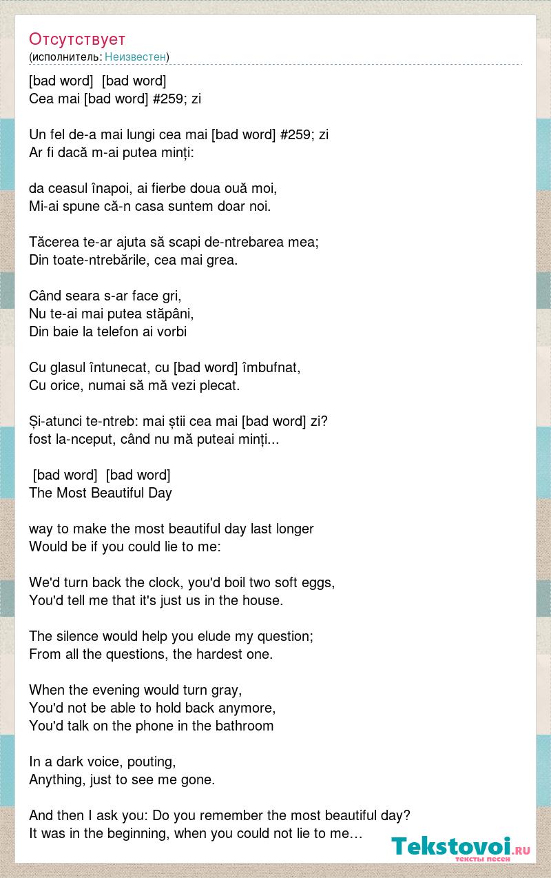 [bad word] [bad word] Cea mai [bad word] #259; zi Un fel de-a mai lungi cea mai [bad word] #259; zi Ar fi dacă m-ai putea minți: da ceasul înapoi, ai fierbe doua ouă moi, Mi-ai spune că-n casa suntem doar noi. Tăcerea te-ar ajuta să scapi de-ntrebarea mea; Din toate-ntrebările, cea mai grea. Când seara s-ar face gri, Nu te-ai mai putea stăpâni, Din baie la telefon ai vorbi Cu glasul întunecat, cu [bad word] îmbufnat, Cu orice, numai să mă vezi plecat. Și-atunci te-ntreb: mai știi cea mai [bad word] zi? fost la-nceput, când nu mă puteai minți... [bad word] [bad word] The Most Beautiful Day way to make the most beautiful day last longer Would be if you could lie to me: We'd turn back the clock, you'd boil two soft eggs, You'd tell me that it's just us in the house. The silence would help you elude my question; From all the questions, the hardest one. When the evening would turn gray, You'd not be able to hold back anymore, You'd talk on the phone in the bathroom In a dark voice, pouting, Anything, just to see me gone. And then I ask you: Do you remember the most beautiful day? It was in the beginning, when you could not lie to me…
