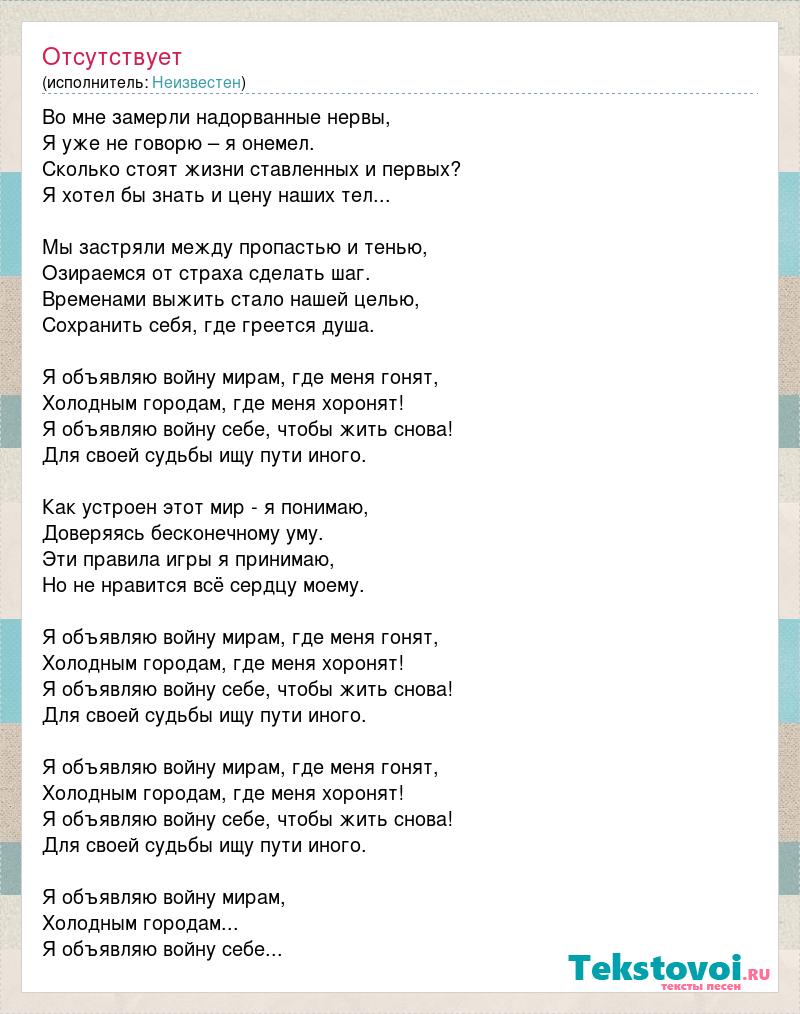 Во мне замерли надорванные нервы, Я уже не говорю – я онемел. Сколько стоят жизни ставленных и первых? Я хотел бы знать и цену наших тел... Мы застряли между пропастью и тенью, Озираемся от страха сделать шаг. Временами выжить стало нашей целью, Сохранить себя, где греется душа. Я объявляю войну мирам, где меня гонят, Холодным городам, где меня хоронят! Я объявляю войну себе, чтобы жить снова! Для своей судьбы ищу пути иного. Как устроен этот мир - я понимаю, Доверяясь бесконечному уму. Эти правила игры я принимаю, Но не нравится всё сердцу моему. Я объявляю войну мирам, где меня гонят, Холодным городам, где меня хоронят! Я объявляю войну себе, чтобы жить снова! Для своей судьбы ищу пути иного. Я объявляю войну мирам, где меня гонят, Холодным городам, где меня хоронят! Я объявляю войну себе, чтобы жить снова! Для своей судьбы ищу пути иного. Я объявляю войну мирам, Холодным городам... Я объявляю войну себе...