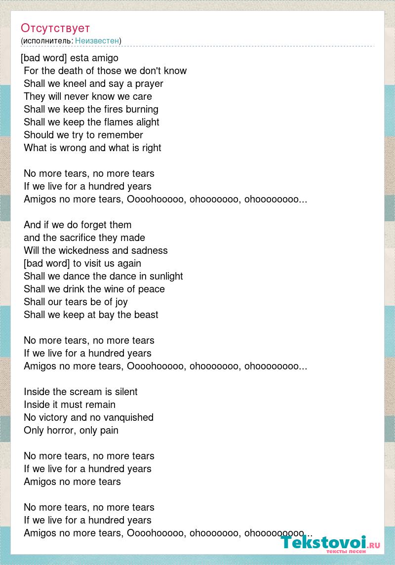 [bad word] esta amigo For the death of those we don't know Shall we kneel and say a prayer They will never know we care Shall we keep the fires burning Shall we keep the flames alight Should we try to remember What is wrong and what is right No more tears, no more tears If we live for a hundred years Amigos no more tears, Oooohooooo, ohooooooo, ohoooooooo... And if we do forget them and the sacrifice they made Will the wickedness and sadness [bad word] to visit us again Shall we dance the dance in sunlight Shall we drink the wine of peace Shall our tears be of joy Shall we keep at bay the beast No more tears, no more tears If we live for a hundred years Amigos no more tears, Oooohooooo, ohooooooo, ohoooooooo... Inside the scream is silent Inside it must remain No victory and no vanquished Only horror, only pain No more tears, no more tears If we live for a hundred years Amigos no more tears No more tears, no more tears If we live for a hundred years Amigos no more tears, Oooohooooo, ohooooooo, ohooooooooo...