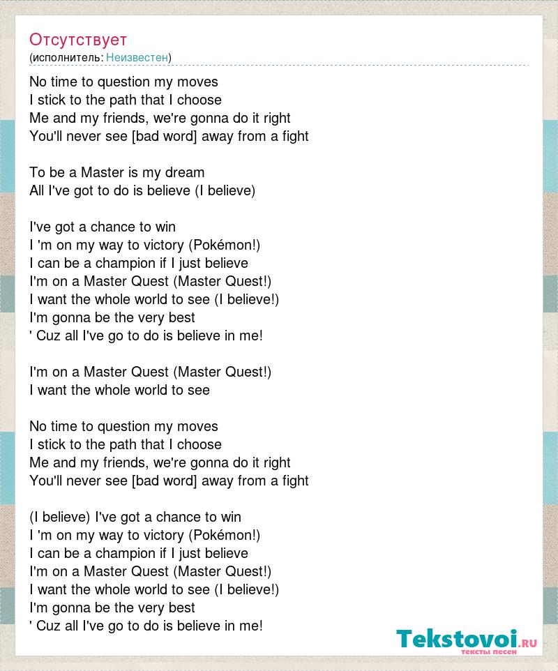 No time to question my moves I stick to the path that I choose Me and my friends, we're gonna do it right You'll never see [bad word] away from a fight To be a Master is my dream All I've got to do is believe (I believe) I've got a chance to win I 'm on my way to victory (Pokémon!) I can be a champion if I just believe I'm on a Master Quest (Master Quest!) I want the whole world to see (I believe!) I'm gonna be the very best ' Cuz all I've go to do is believe in me! I'm on a Master Quest (Master Quest!) I want the whole world to see No time to question my moves I stick to the path that I choose Me and my friends, we're gonna do it right You'll never see [bad word] away from a fight (I believe) I've got a chance to win I 'm on my way to victory (Pokémon!) I can be a champion if I just believe I'm on a Master Quest (Master Quest!) I want the whole world to see (I believe!) I'm gonna be the very best ' Cuz all I've go to do is believe in me!