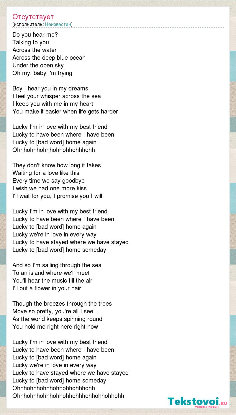 Do you hear me? Talking to you Across the water Across the deep blue ocean Under the open sky Oh my, baby I'm trying Boy I hear you in my dreams I feel your whisper across the sea I keep you with me in my heart You make it easier when life gets harder Lucky I'm in love with my best friend Lucky to have been where I have been Lucky to [bad word] home again Ohhhohhhohhhohhohhohhhohh They don't know how long it takes Waiting for a love like this Every time we say goodbye I wish we had one more kiss I'll wait for you, I promise you I will Lucky I'm in love with my best friend Lucky to have been where I have been Lucky to [bad word] home again Lucky we're in love in every way Lucky to have stayed where we have stayed Lucky to [bad word] home someday And so I'm sailing through the sea To an island where we'll meet You'll hear the music fill the air I'll put a flower in your hair Though the breezes through the trees Move so pretty, you're all I see As the world keeps spinning round You hold me right here right now Lucky I'm in love with my best friend Lucky to have been where I have been Lucky to [bad word] home again Lucky we're in love in every way Lucky to have stayed where we have stayed Lucky to [bad word] home someday Ohhhohhhohhhohhohhohhhohh Ohhhohhhohhhohhohhohhhohhohhohhohh