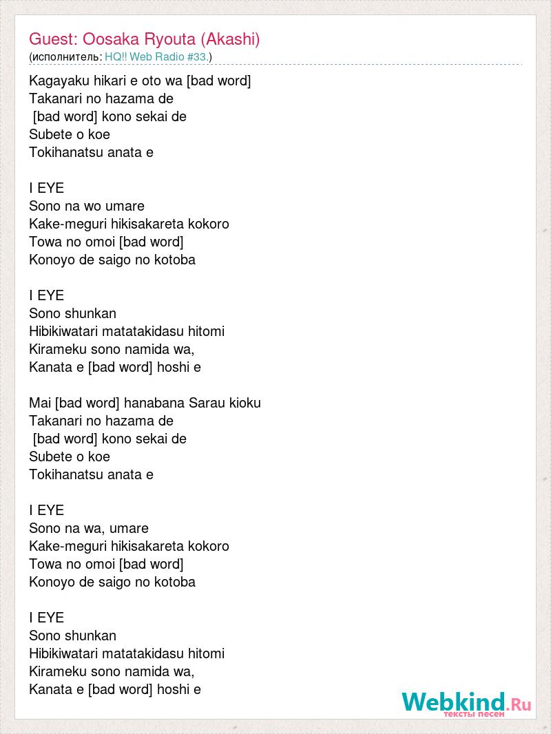 Kagayaku hikari e oto wa [bad word] Takanari no hazama de [bad word] kono sekai de Subete o koe Tokihanatsu anata e I EYE Sono na wo umare Kake-meguri hikisakareta kokoro Towa no omoi [bad word] Konoyo de saigo no kotoba I EYE Sono shunkan Hibikiwatari matatakidasu hitomi Kirameku sono namida wa, Kanata e [bad word] hoshi e Mai [bad word] hanabana Sarau kioku Takanari no hazama de [bad word] kono sekai de Subete o koe Tokihanatsu anata e I EYE Sono na wa, umare Kake-meguri hikisakareta kokoro Towa no omoi [bad word] Konoyo de saigo no kotoba I EYE Sono shunkan Hibikiwatari matatakidasu hitomi Kirameku sono namida wa, Kanata e [bad word] hoshi e