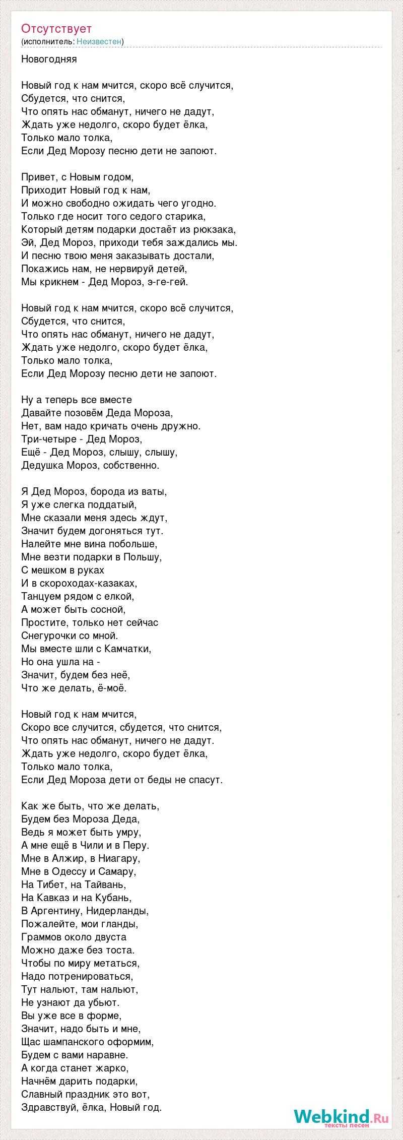 Новогодняя Новый год к нам мчится, скоро всё случится, Сбудется, что снится, Что опять нас обманут, ничего не дадут, Ждать уже недолго, скоро будет ёлка, Только мало толка, Если Дед Морозу песню дети не запоют. Привет, с Новым годом, Приходит Новый год к нам, И можно свободно ожидать чего угодно. Только где носит того седого старика, Который детям подарки достаёт из рюкзака, Эй, Дед Мороз, приходи тебя заждались мы. И песню твою меня заказывать достали, Покажись нам, не нервируй детей, Мы крикнем - Дед Мороз, э-ге-гей. Новый год к нам мчится, скоро всё случится, Сбудется, что снится, Что опять нас обманут, ничего не дадут, Ждать уже недолго, скоро будет ёлка, Только мало толка, Если Дед Морозу песню дети не запоют. Ну а теперь все вместе Давайте позовём Деда Мороза, Нет, вам надо кричать очень дружно. Три-четыре - Дед Мороз, Ещё - Дед Мороз, cлышу, слышу, Дедушка Мороз, собственно. Я Дед Мороз, борода из ваты, Я уже слегка поддатый, Мне сказали меня здесь ждут, Значит будем догоняться тут. Налейте мне вина побольше, Мне везти подарки в Польшу, С мешком в руках И в скороходах-казаках, Танцуем рядом с елкой, А может быть сосной, Простите, только нет сейчас Снегурочки со мной. Мы вместе шли с Камчатки, Но она ушла на - Значит, будем без неё, Что же делать, ё-моё. Новый год к нам мчится, Скоро все случится, сбудется, что снится, Что опять нас обманут, ничего не дадут. Ждать уже недолго, скоро будет ёлка, Только мало толка, Если Дед Мороза дети от беды не спасут. Как же быть, что же делать, Будем без Мороза Деда, Ведь я может быть умру, А мне ещё в Чили и в Перу. Мне в Алжир, в Ниагару, Мне в Одессу и Самару, На Тибет, на Тайвань, На Кавказ и на Кубань, В Аргентину, Нидерланды, Пожалейте, мои гланды, Граммов около двуста Можно даже без тоста. Чтобы по миру метаться, Надо потренироваться, Тут нальют, там нальют, Не узнают да убьют. Вы уже все в форме, Значит, надо быть и мне, Щас шампанского оформим, Будем с вами наравне. А когда станет жарко, Начнём дарить подарки, Славный праздник это вот, Здравствуй, ёлка, Новый год.
