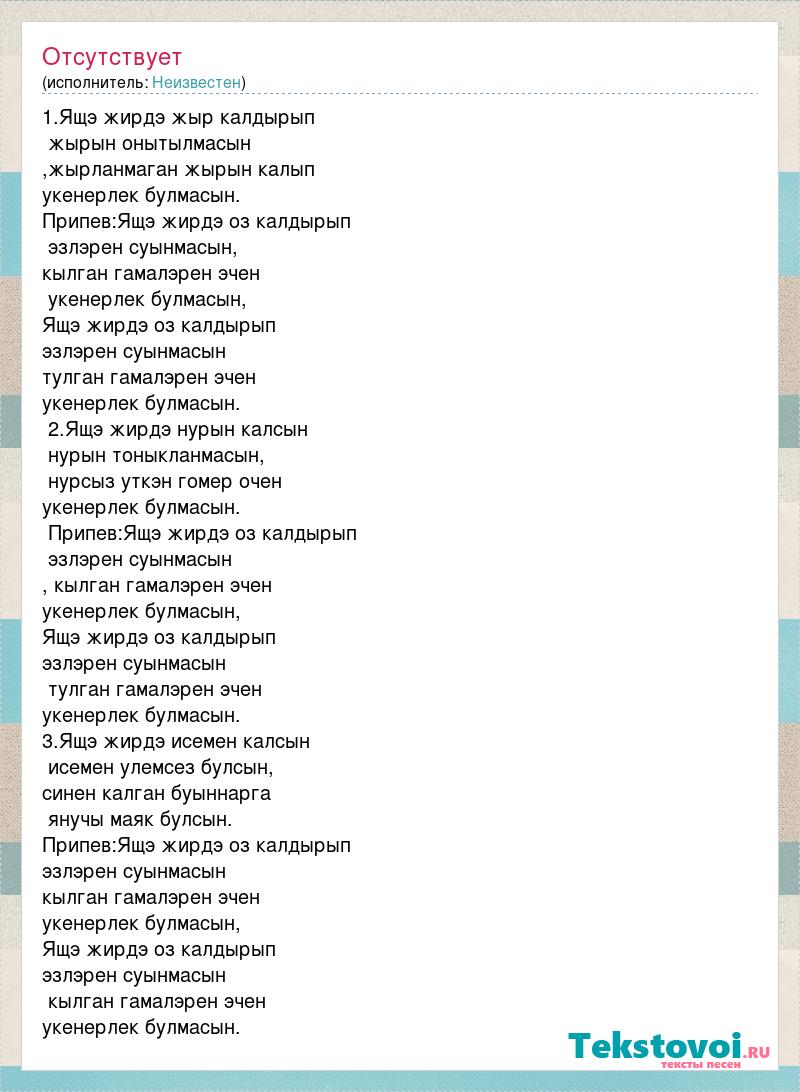 1.Ящэ жирдэ жыр калдырып жырын онытылмасын ,жырланмаган жырын калып укенерлек булмасын. Припев:Ящэ жирдэ оз калдырып эзлэрен суынмасын, кылган гамалэрен эчен укенерлек булмасын, Ящэ жирдэ оз калдырып эзлэрен суынмасын тулган гамалэрен эчен укенерлек булмасын. 2.Ящэ жирдэ нурын калсын нурын тоныкланмасын, нурсыз уткэн гомер очен укенерлек булмасын. Припев:Ящэ жирдэ оз калдырып эзлэрен суынмасын , кылган гамалэрен эчен укенерлек булмасын, Ящэ жирдэ оз калдырып эзлэрен суынмасын тулган гамалэрен эчен укенерлек булмасын. 3.Ящэ жирдэ исемен калсын исемен улемсез булсын, синен калган буыннарга янучы маяк булсын. Припев:Ящэ жирдэ оз калдырып эзлэрен суынмасын кылган гамалэрен эчен укенерлек булмасын, Ящэ жирдэ оз калдырып эзлэрен суынмасын кылган гамалэрен эчен укенерлек булмасын.