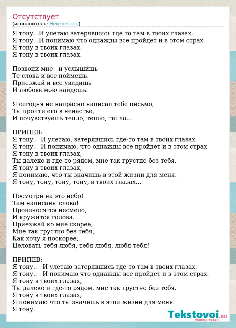 Я тону...И улетаю затерявшись где то там в твоих глазах. Я тону...И понимаю что однажды все пройдет и в этом страх. Я тону в твоих глазах. Я тону в твоих глазах. Позвони мне - и услышишь Те слова и все поймешь. Приезжай и все увидишь И любовь мою найдешь. Я сегодня не напрасно написал тебе письмо, Ты прочти его в ненастье, И почувствуешь тепло, тепло, тепло... ПРИПЕВ: Я тону.. И улетаю, затерявшись где-то там в твоих глазах. Я тону.. И понимаю, что однажды все пройдет и в этом страх. Я тону в твоих глазах, Ты далеко и где-то рядом, мне так грустно без тебя. Я тону в твоих глазах, Я понимаю, что ты значишь в этой жизни для меня. Я тону, тону, тону, тону, в твоих глазах... Посмотри на это небо! Там написаны слова! Произносятся несмело, И кружится голова. Приезжай ко мне скорее, Мне так грустно без тебя, Как хочу я поскорее, Целовать тебя любя, тебя любя, любя тебя! ПРИПЕВ: Я тону.. И улетаю затерявшись где-то там в твоих глазах. Я тону.. И понимаю что однажды все пройдет и в этом страх. Я тону в твоих глазах, Ты далеко и где-то рядом, мне так грустно без тебя. Я тону в твоих глазах, Я понимаю что ты значишь в этой жизни для меня. Я тону.